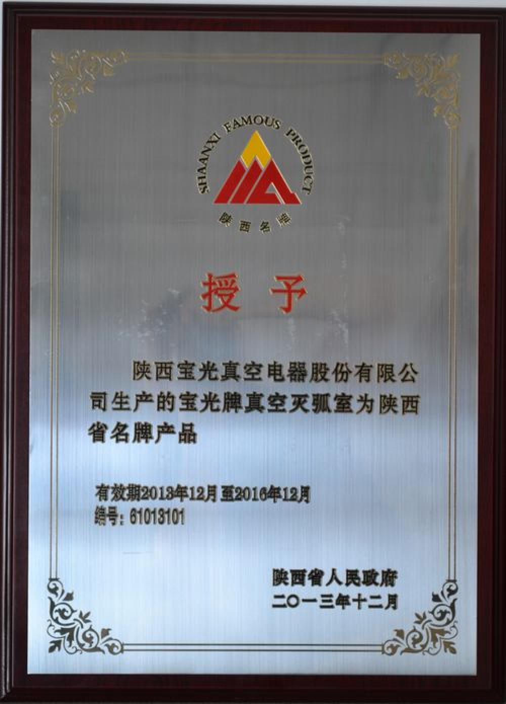 寶光牌真空滅弧室被授予陜西省名牌產(chǎn)品稱號
