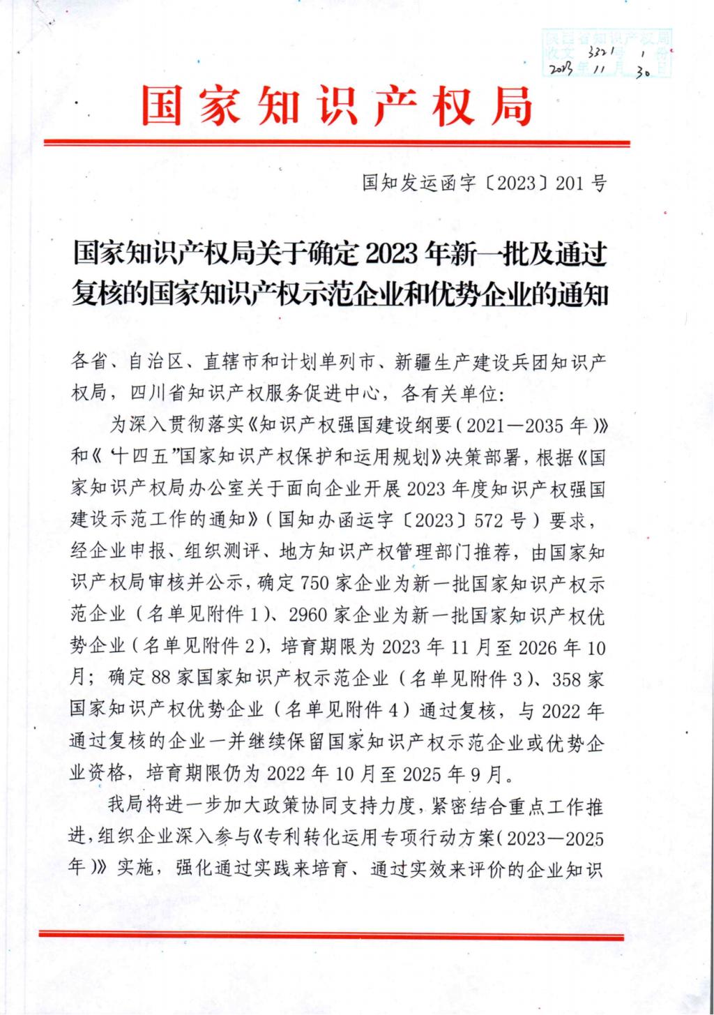 2023年榮獲國家知識產(chǎn)權示范企業(yè)和優(yōu)勢企業(yè)