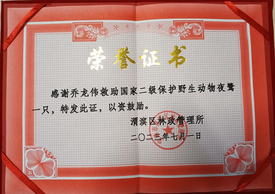 近期,寶光股份零件產(chǎn)品制造部喬龍偉同志成功救助一只夜鷺,獲渭濱區(qū)林政管理所表彰。