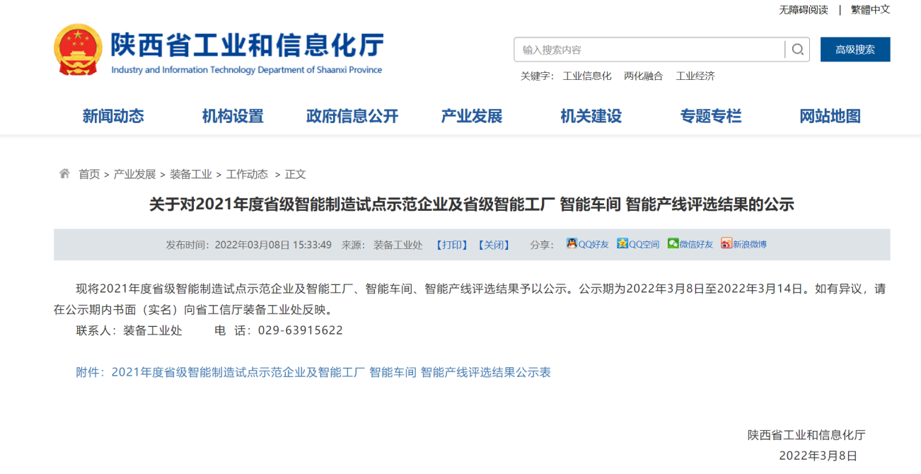 3月14日,陜西省工信廳裝備工業處發布2021年度省級智能制造試點示范企業及省級智能工廠名單,寶光股份獲評“2021年度省級智能工廠”。