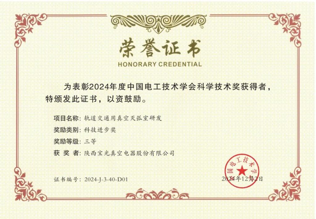 項目名稱:軌道交通用真空滅弧室研發(fā)。項目簡介:本項目研發(fā)出的BGH2570、BGH2580、BGH2590/R、BGH2530等系列化產(chǎn)品,可替代進口產(chǎn)品。4種產(chǎn)品全部通過了裝車運行驗證,部分產(chǎn)品實現(xiàn)了小批量供貨。其中BGH2570型產(chǎn)品于2023年9月通過了中國機械工業(yè)聯(lián)合會產(chǎn)品鑒定,技術(shù)水平達到國際領(lǐng)先。2021年至2024年累計銷量超過1000只,累計銷售額超過超過600萬元。